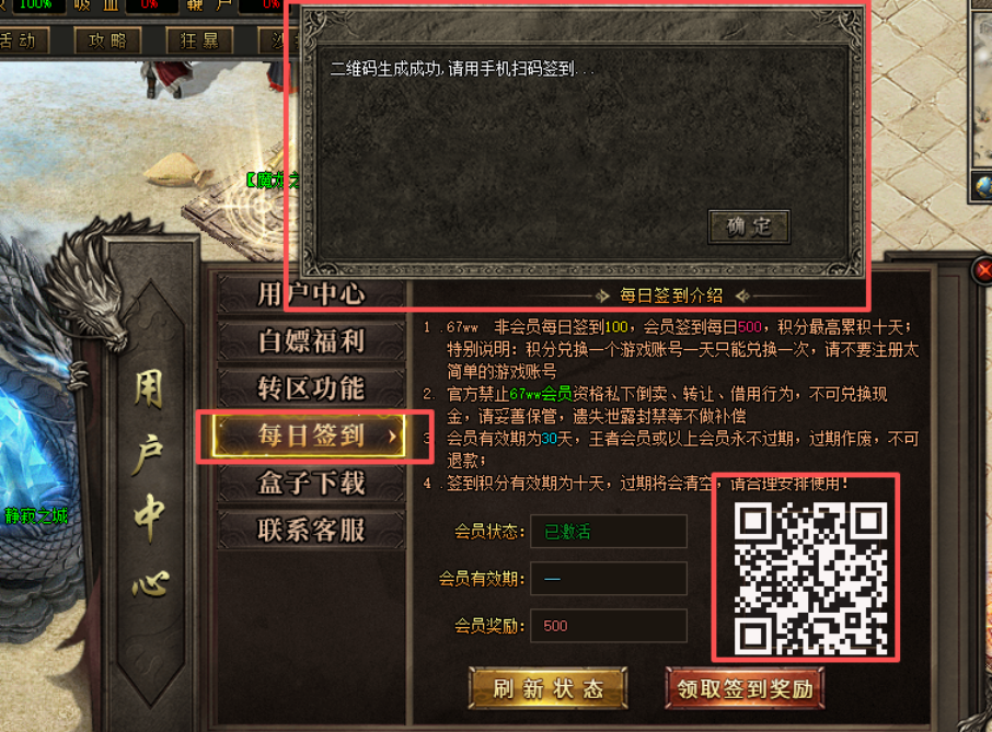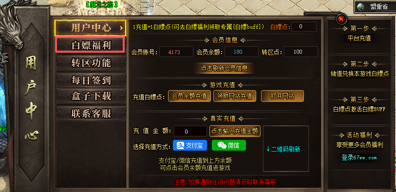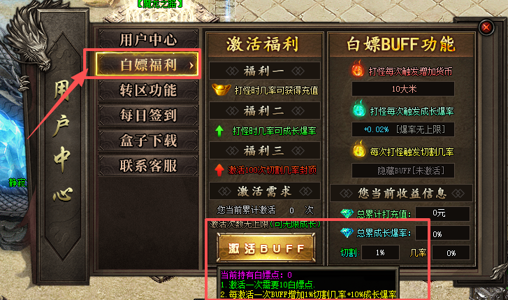 4、进入游戏点击左上方的用户中心,点击(白嫖福利)按钮激活buff