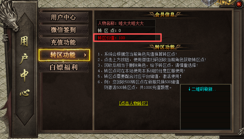 2.转区额度计算:系统将根据您当前角色的历史总充值金额,按100%的比例回收转区点。