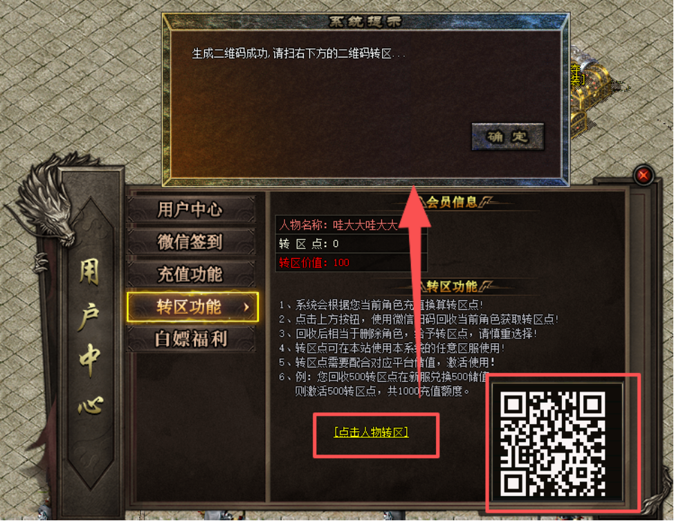 2、若转区价值有数量即可点击人物转区生成转区二维码,打开微信扫一扫操作